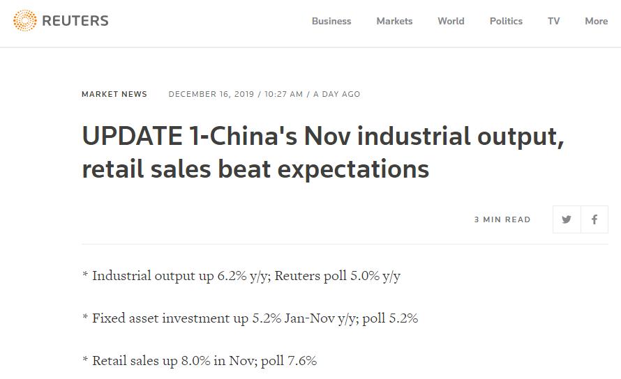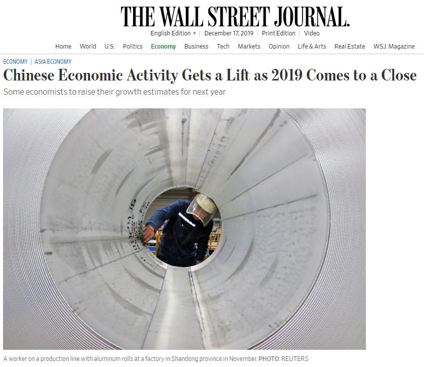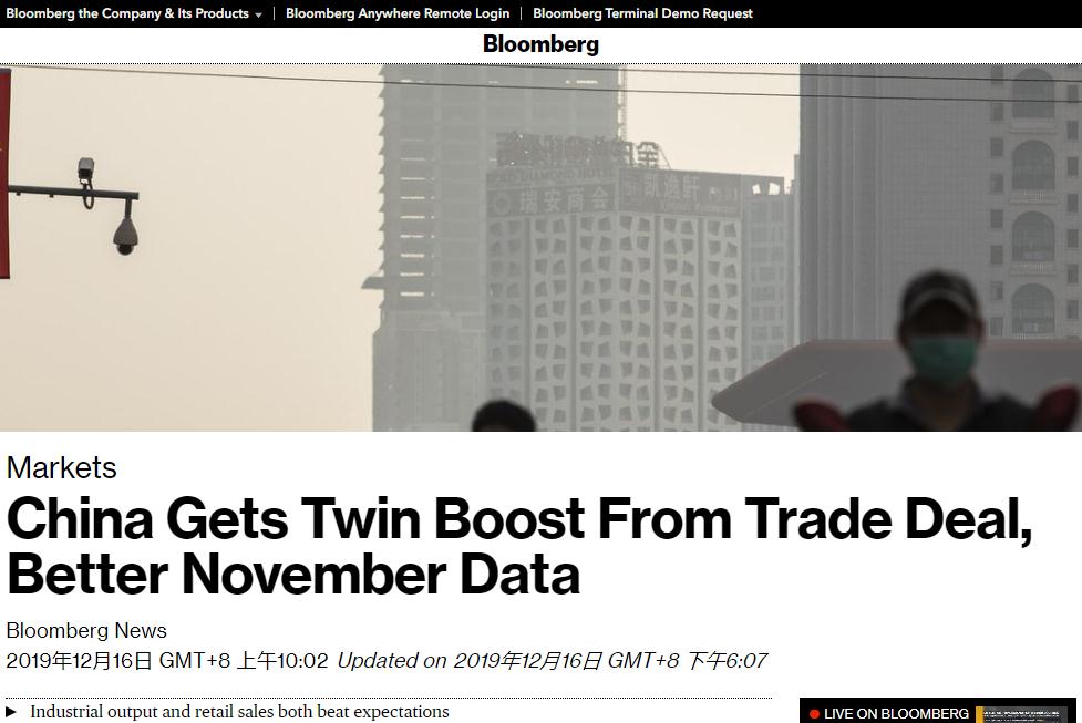 The report also pointed out that the latest economic data prompted some economists to raise their expectations for China’s economic growth next year. After the data was released on 16th, economists from UBS Group AG and Oxford Economics raised their forecast of China’s economic growth rate to 6% in 2020 from the previous 5.7%.